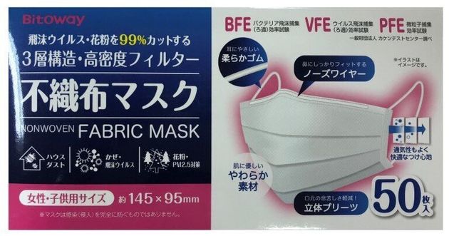 | 不織布マスク 女性・子供用(サイズ:145×95mm、50枚入り | 3590円 |