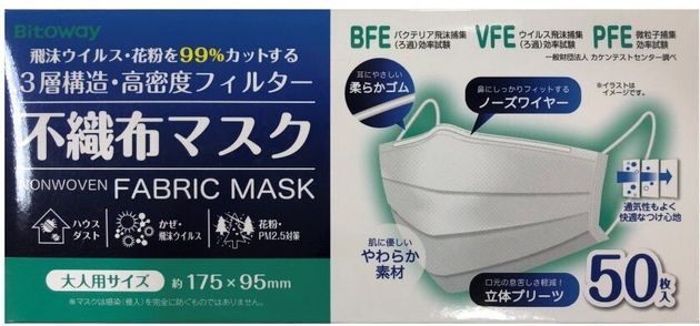 | 不織布マスク 大人用(サイズ:175×95mm、50枚入り) | 3590円 |