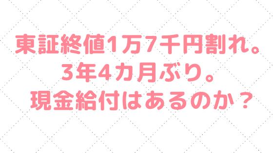 東京株式市場の日経平均株価(225種)終値は3年4カ月ぶり1万7千円割れとなり