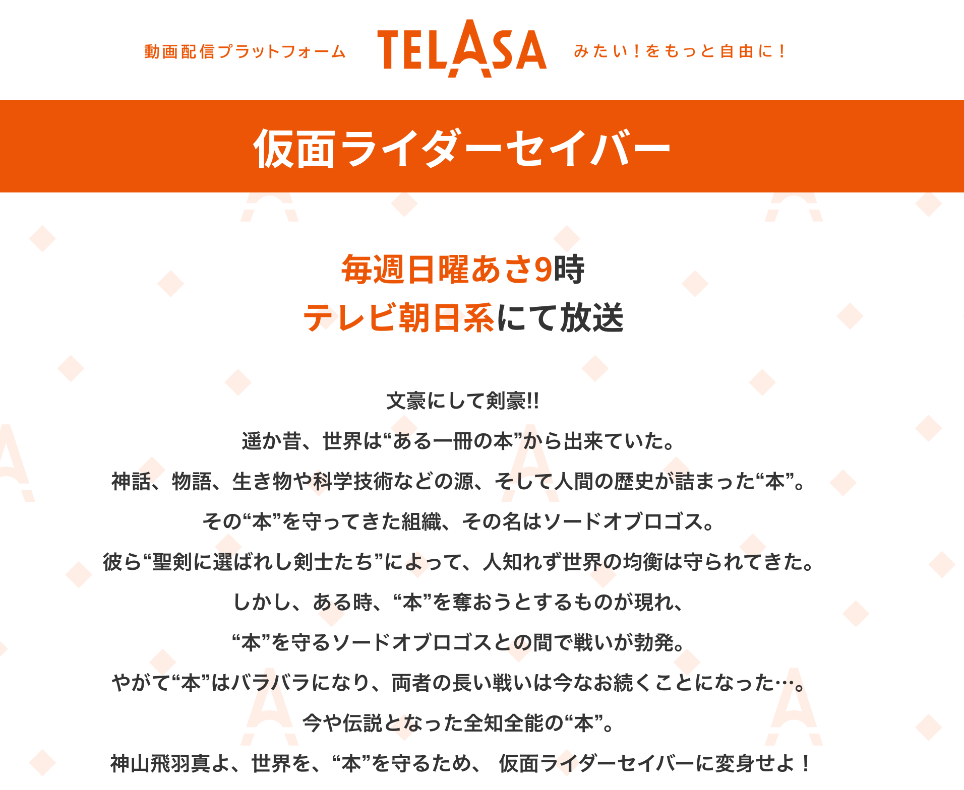 仮面ライダーシリーズを配信している「動画配信サイトTELASA」なら仮面ライダーセイバーの見逃し配信がされています。