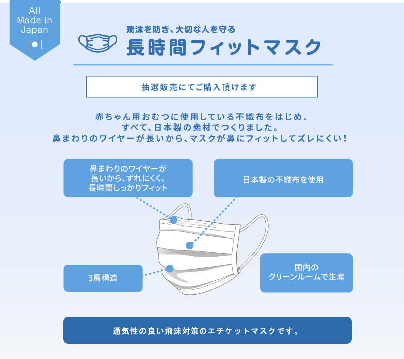 耳ひもなどを含め、全て日本製の素材を使用し、日本国内のクリーンルームで生産している。