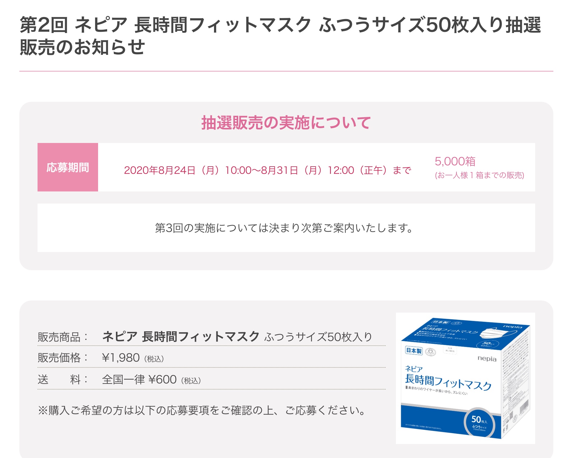 第二回ネピアマスクの抽選申込受付期間は8月24日から31日。