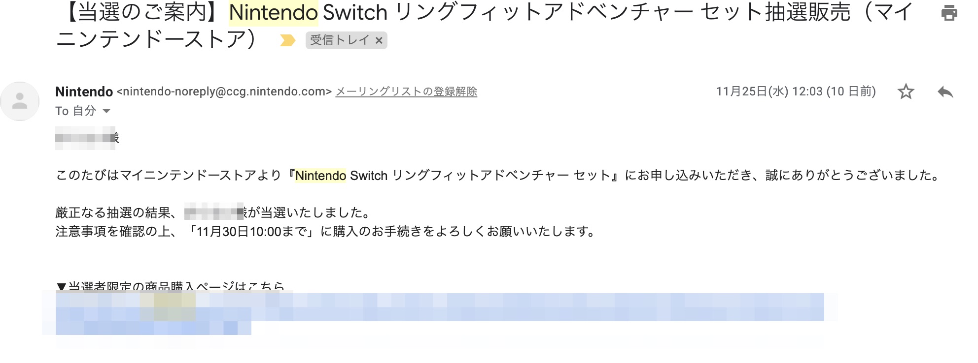 私の場合、マイニンテンドーストア「Nintendo Switch リングフィット アドベンチャー セット」抽選申し込みをしたのですが、2回応募して2回目でサクッと当選しました☆