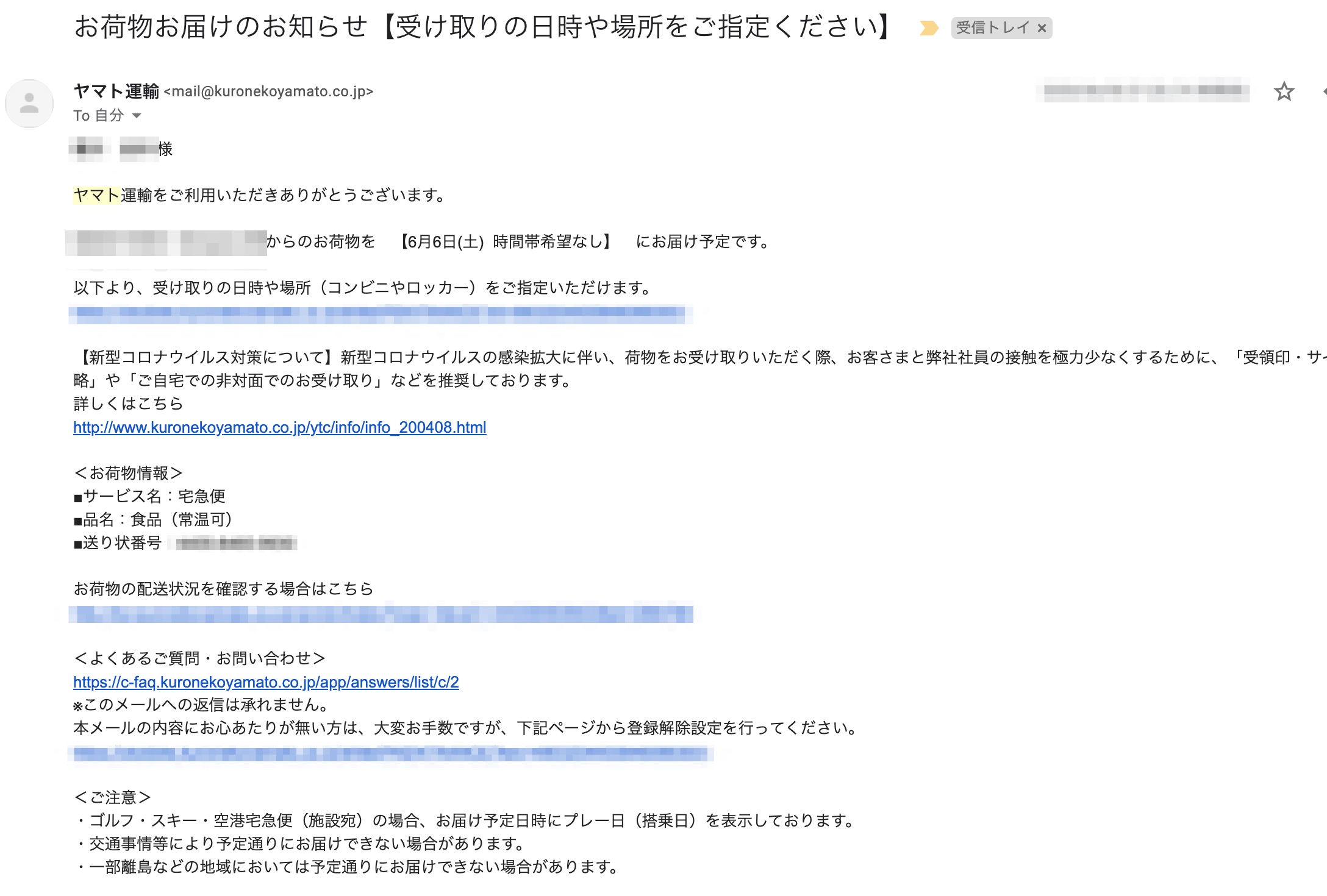 ヤマト運輸の場合、クロネコメンバーズ会員登録をしておくと下の画像のようなメールが届きます。