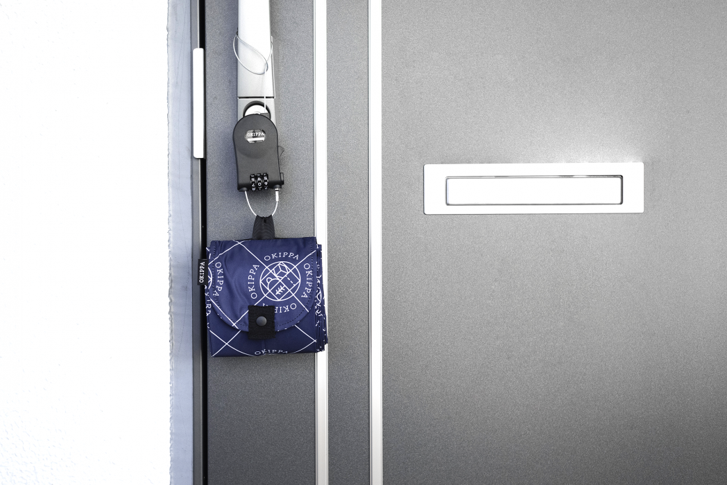 玄関口や玄関周辺に固定する”OKIPPA”専用ロックと、内鍵として南京錠が付属して盗難防止に役立ちます。