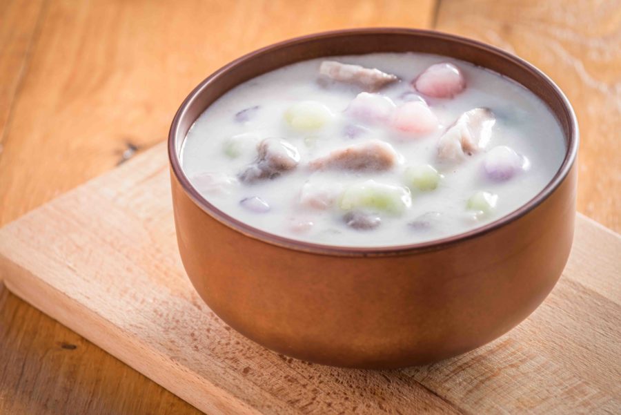 ブアローイはココナッツのクリームから作られる温かいスープの中に紫イモ、人参、カボチャ等を裏ごしした白玉団子が入っているスイーツ。