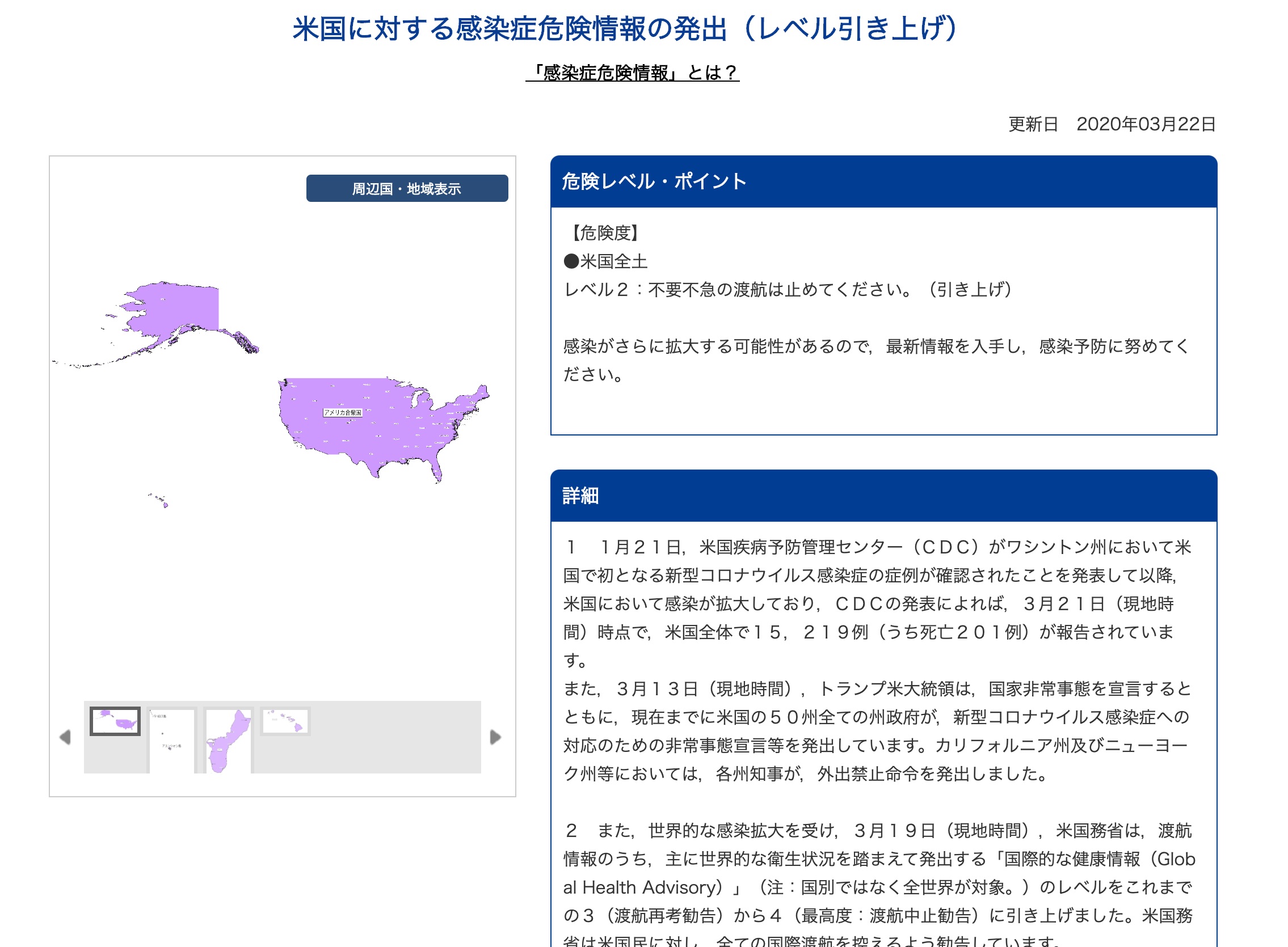 2020年3月22日 日本外務省はアメリカの渡航レベルを、不要不急の渡航の自粛を求めるレベル2に引きあげています。
