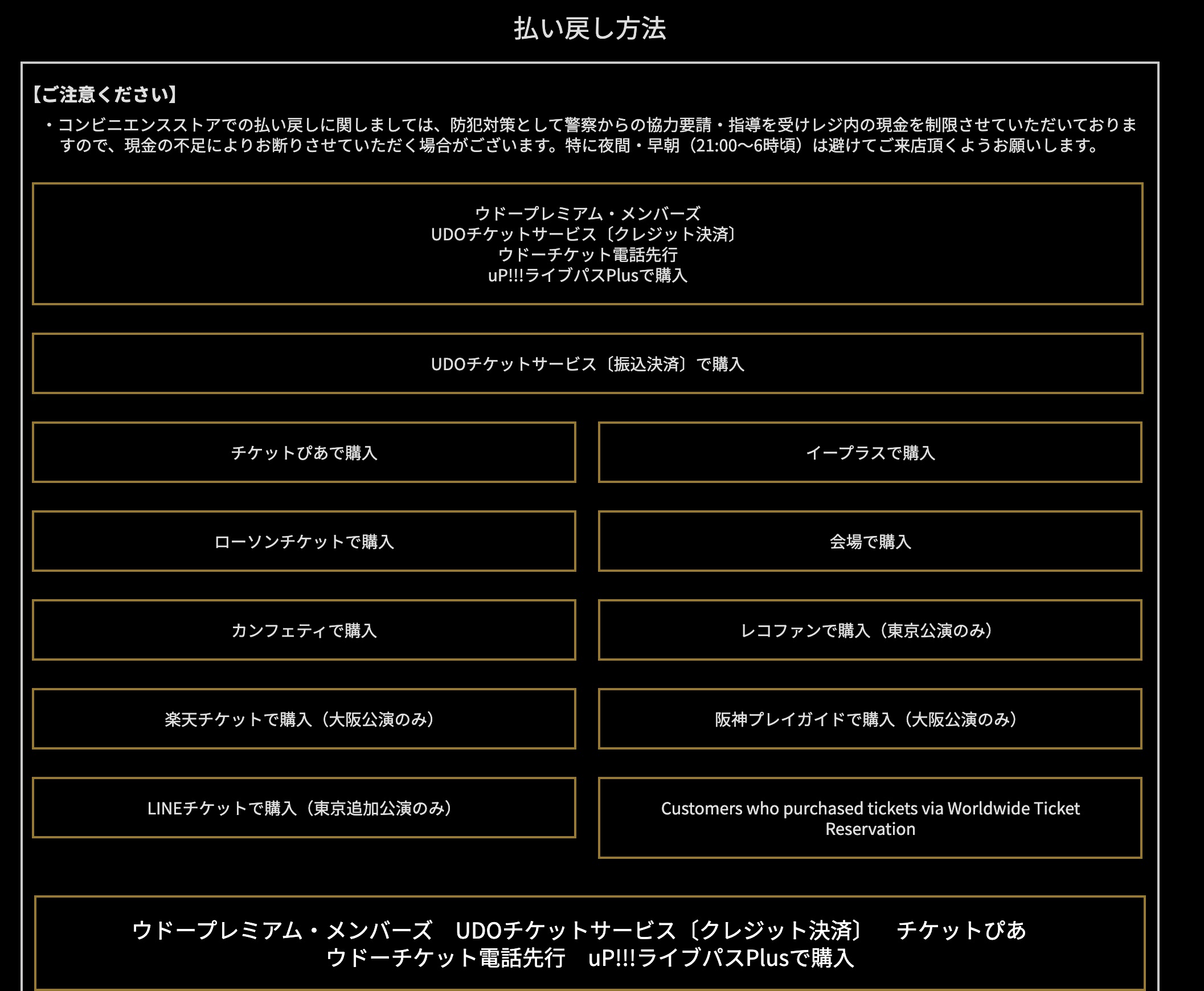 [st-mybox title=”注意ポイント” fontawesome=”fa-exclamation-circle” color=”#ef5350″ bordercolor=”#ef5350″ bgcolor=”#ffebee” borderwidth=”2″ borderradius=”5″ titleweight=”bold”]チケット払い戻し方法は購入方法によって異なりますので【中止】BOB DYLAN – ウドー音楽事務所にかかれている