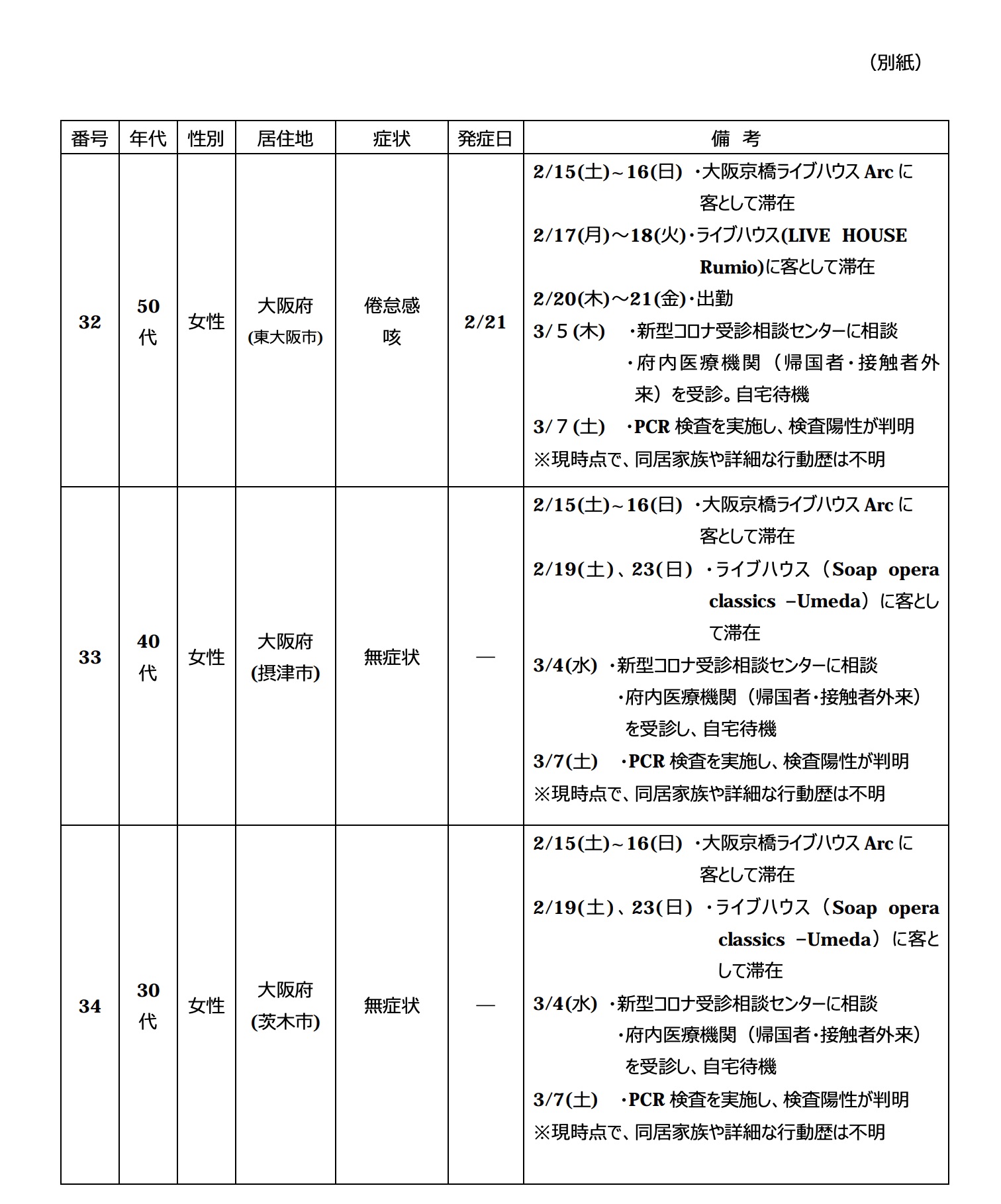 (3)その他 本日(3月7日)、判明しました府内32例目の患者は、19時から22時まで会場に客として参加し、3月4日に判明しました府内12例目の患者は、関係者として参加。