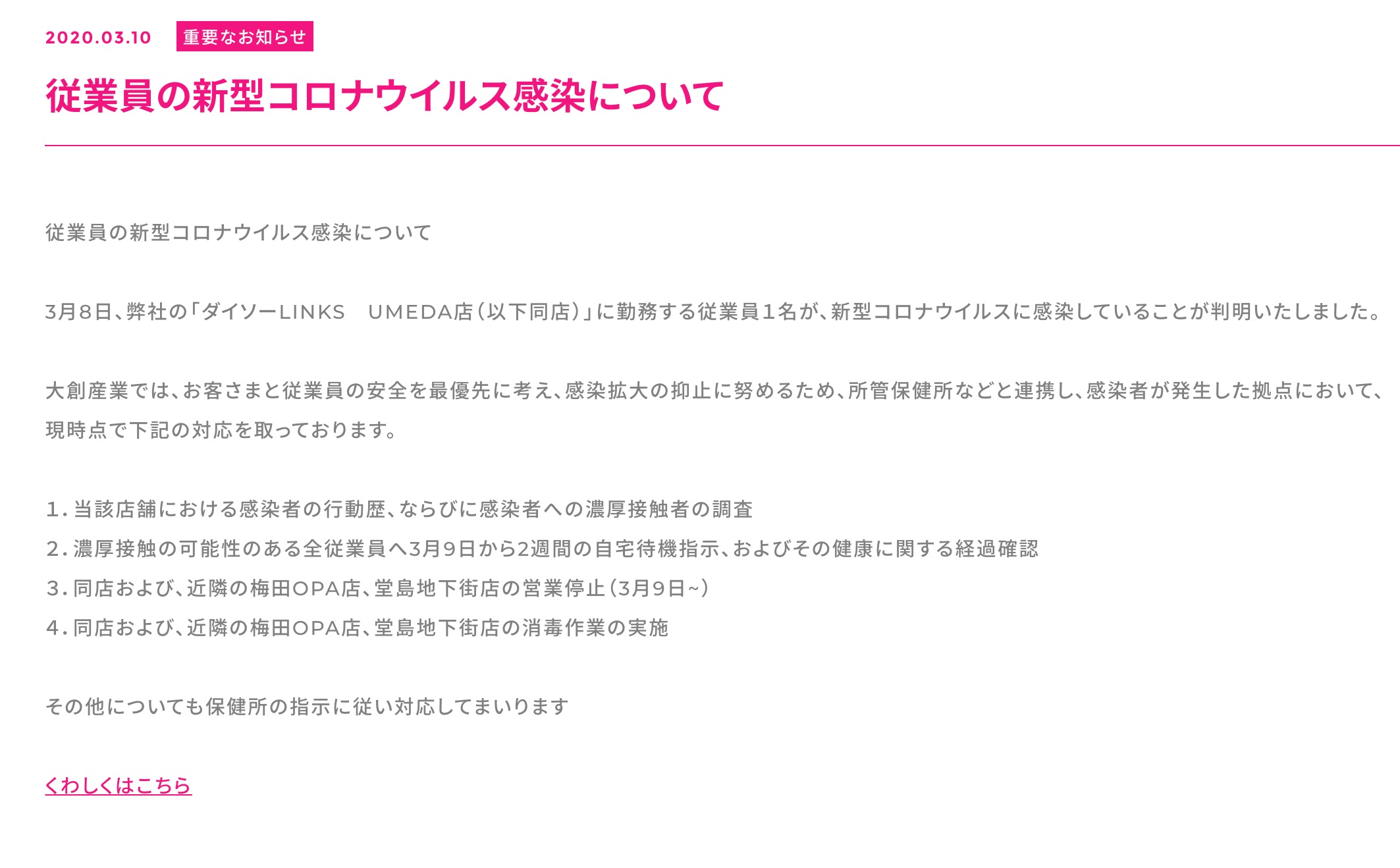 3月10日に「ダイソーLINKS UMEDA店」に勤務する従業員1名が3月8日、新型567に感染していることが報道されました。