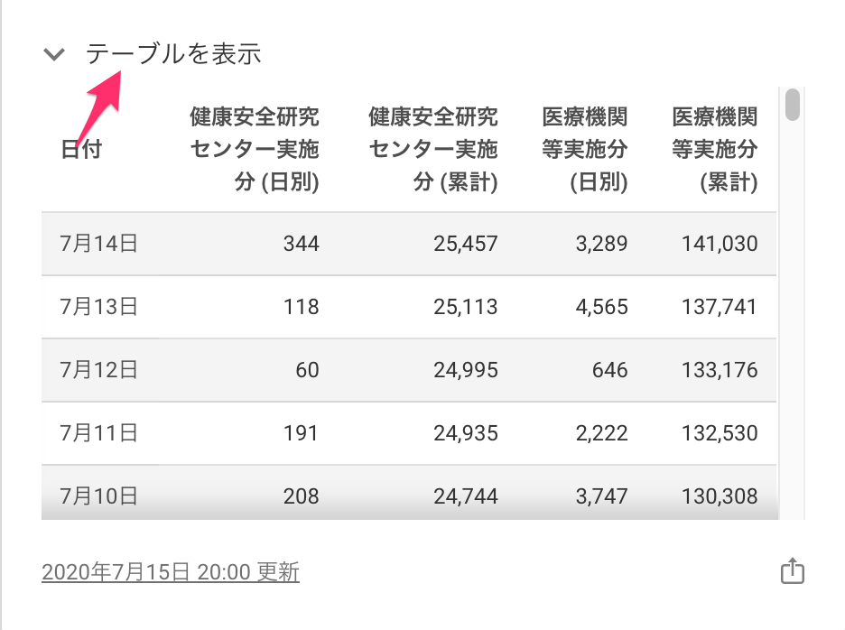 「テーブルを表示」の部分を押すと、グラフのデータが表になって確認できます。